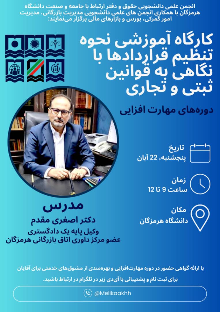 برگزاری کارگاه آموزشی «نحوه تنظیم قراردادها با نگاهی به قوانین ثبتی و تجاری» در دانشگاه هرمزگان