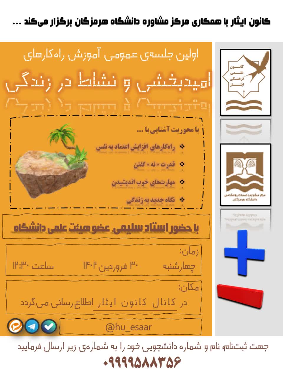 اولین جلسه‌ی عمومی آموزش راهکارهای «امیدبخشی و نشاط در زندگی» با همکاری مرکز مشاوره‌ی دانشگاه هرمزگان با حضور استاد سلیمی، عضو هئیت علمی دانشگاه هرمزگان زمان: چهارشنبه - ۳۰ فروردین ۱۴۰۲ ساعت ۱۲:۳۰ تا ۱۳:۳۰ مکان: در کانال اعلام می‌گردد جهت ثبت‌نام، نام و شماره‌دانشجویی خود را به شماره‌ی زیر ارسال فرمایید 09999588356
