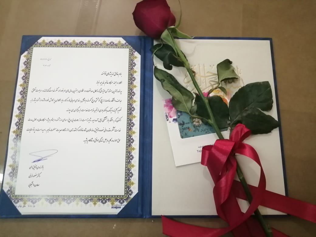 شنبه 21 خرداد ماه در مراسمی با حضور کلیه مدیران و کارکنان حوزه معاونت دانشجویی و سرپرست محترم حراست دانشگاه و به همت معاون محترم دانشجویی جناب آقای دکتر منصور فرخی از سی سال خدمات صادقانه و تلاش های موثر سرکار خانم خدیجه خباز در بخش های مختلف حوزه معاونت دانشجویی تقدیر گردید.