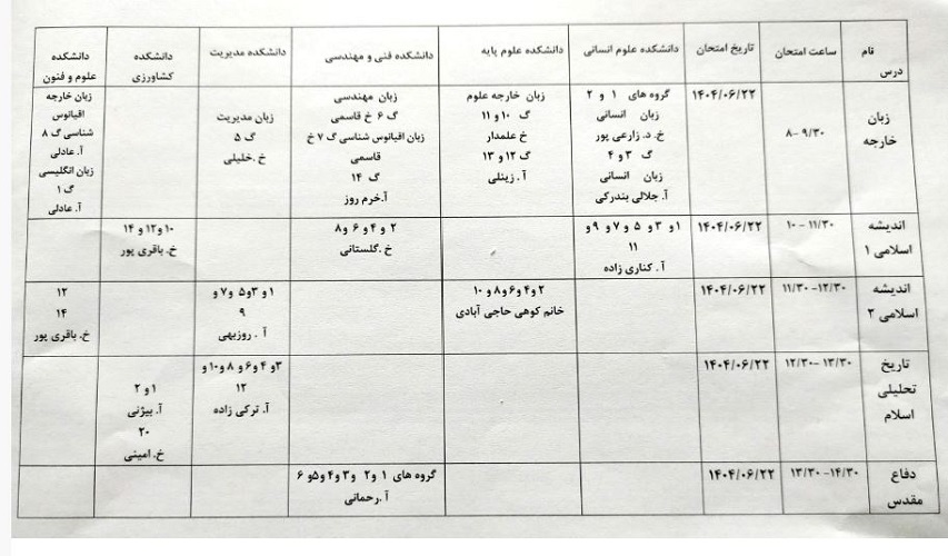 برنامه امتحانات دروس عمومی و معارف، شنبه مورخ 1404/06/22 به تفکیک دانشکده ها