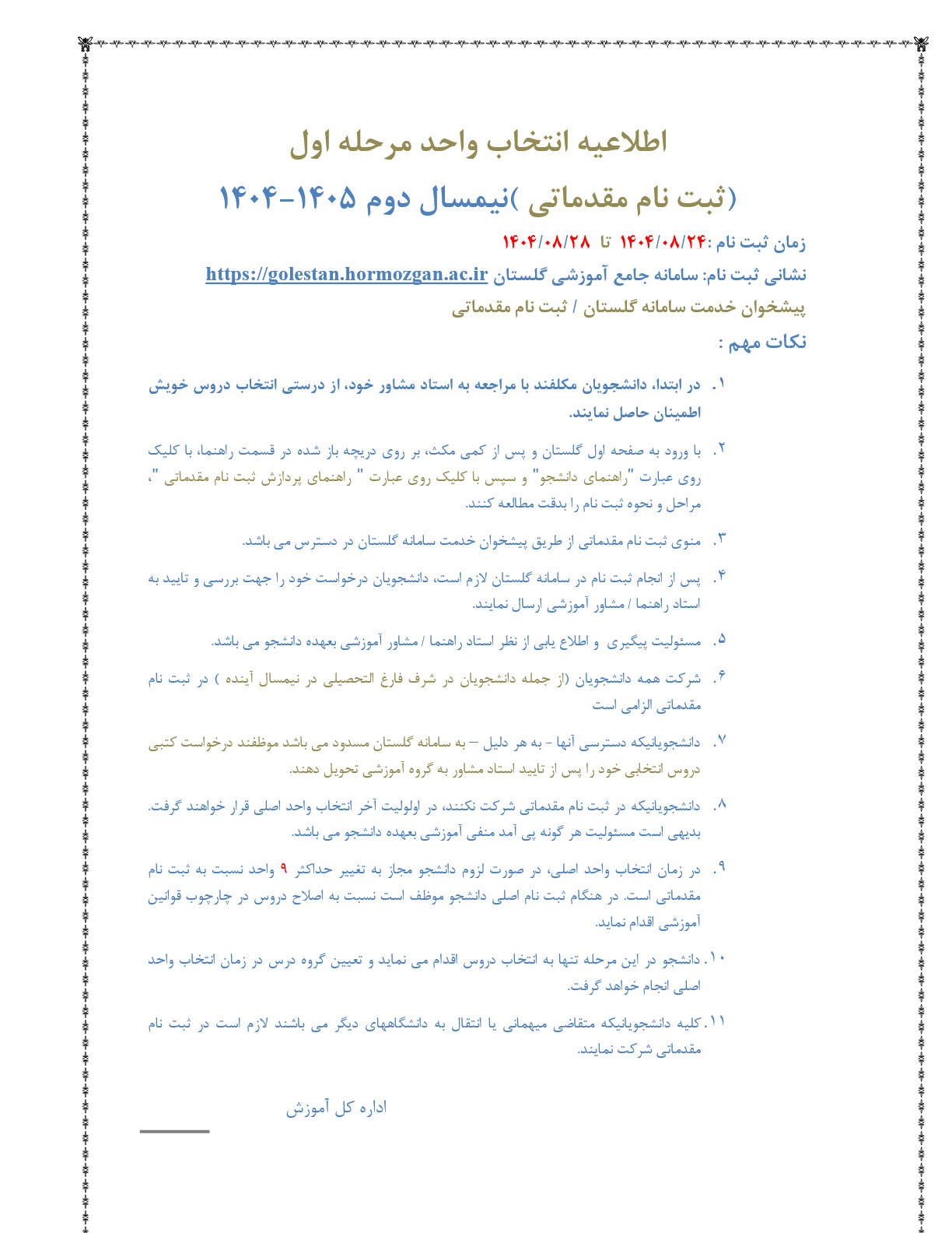 اطلاعیه انتخاب واحد
